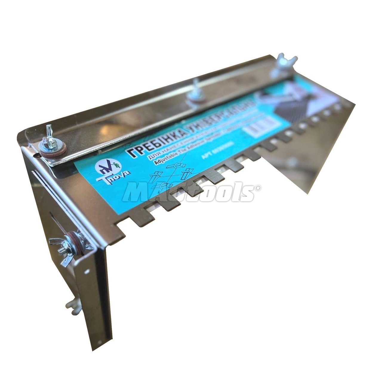 Гребенка универсальная раздвижная для нанесения клея, зубы 10х10 мм, 12х12 мм, 14х14 мм. Рабочая часть изготовлена из нержавеющей стали. С помощью гребенки клей равномерно наносится на основу, что ускоряет выполнение работы, устройство универсально и подходит для укладки плитки разных размеров.