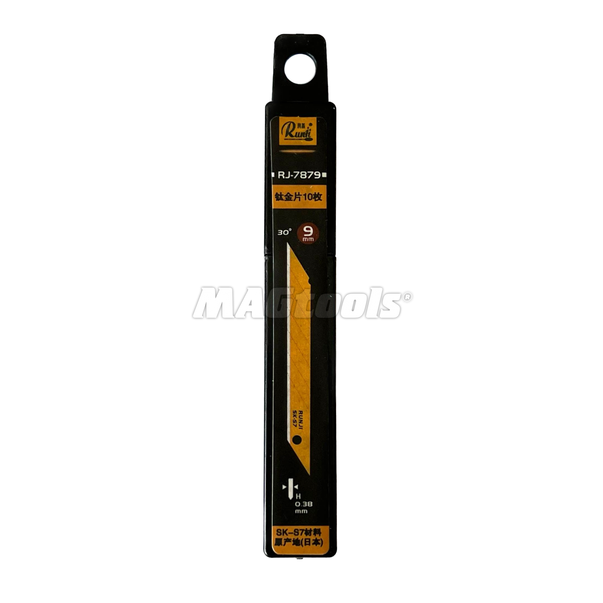 Лезвия для ножа 9 мм GOLD, лазерная заточка SK-7, 10 шт. Изготовлены из стали высокого качества, что обеспечивает долговечность и остроту режущей кромки. Острое лезвие предназначено для нарезания материала, идеально подходит для работы с бумагой, картоном, пленкой и другими тонкими материалами.