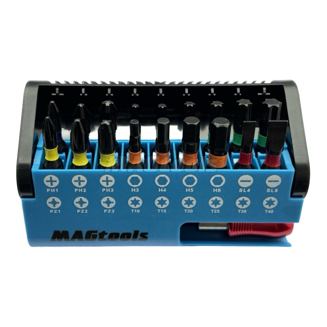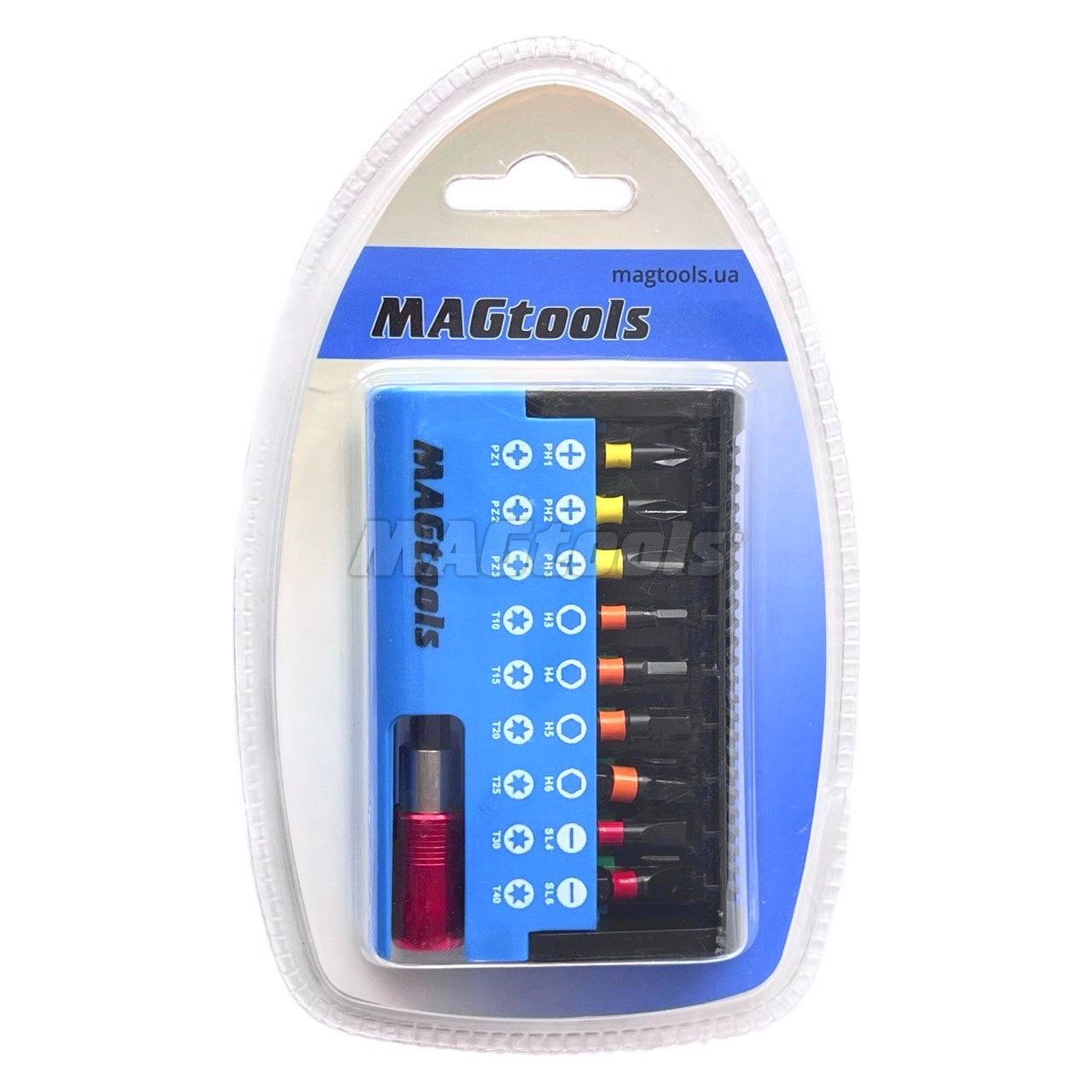 Набор бит с держателем 19 шт, биты длиной 25 мм в пластиковом кейсе. (PH1, PH2, PH3, H3, H4, H5, H6, SL4, SL6, PZ1, PZ2, PZ3, T10, T15, T20, T25, T30, T40). Цветной магнитный держатель 60 мм с автофиксацией биты.