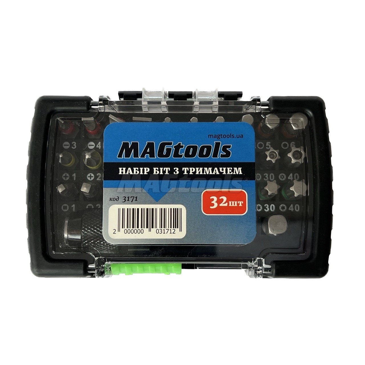 Набор бит с держателем 32 шт, биты длиной 25 мм в пластиковом кейсе (SL3, SL4, SL5.5, SL6.5, H2, H2.5, H3, H4, H5, H6, PH1, PH2, PH3, PH4, TT15, TT15, TT20, TT25, TT30, TT40, SQ1, SQ2, SQ2, SQ3, T15, T15, T20, T25, T30, T40 + адаптер переходник к торцевым головкам + магнитный держатель бит). Цветной держатель бит с автофиксацией 60 мм.