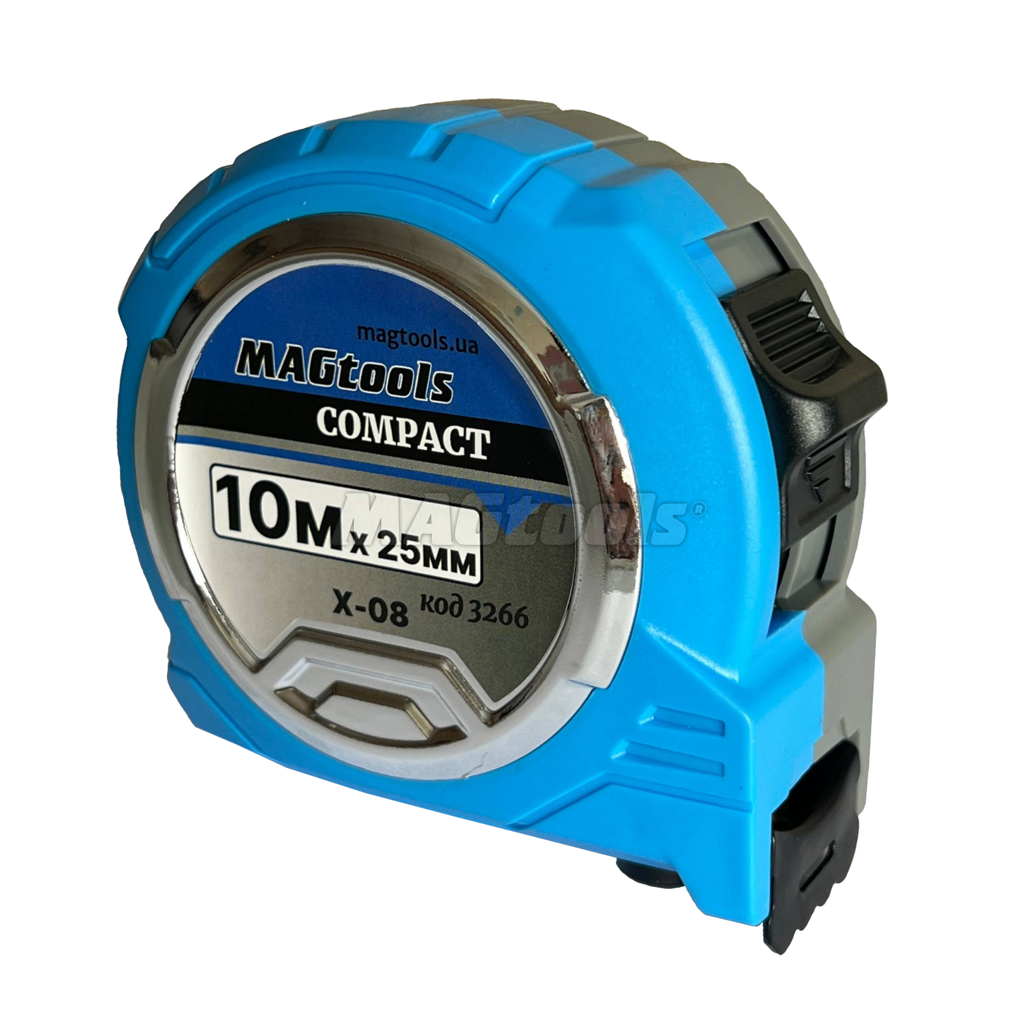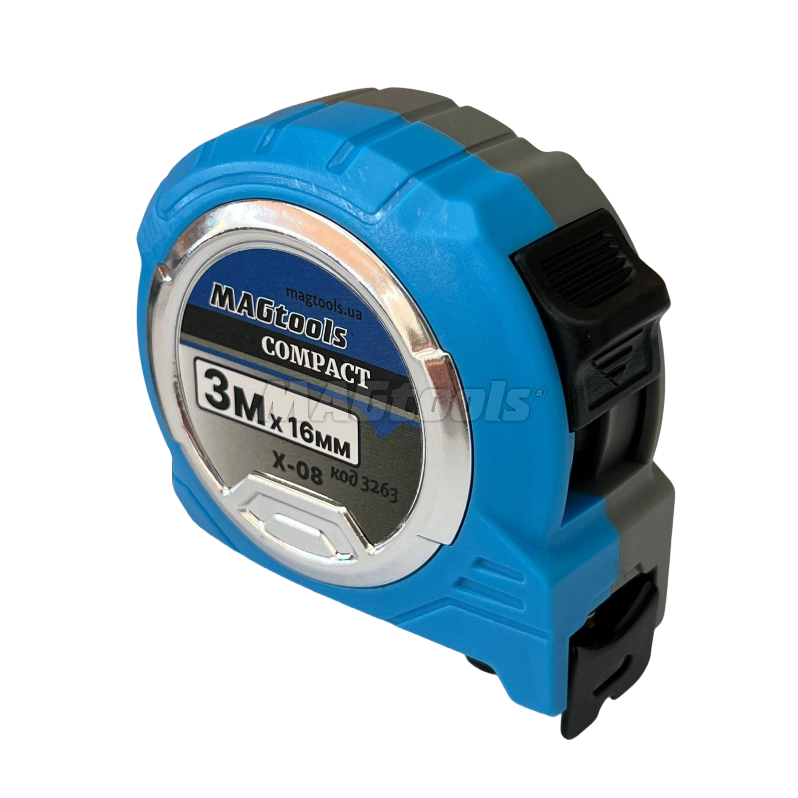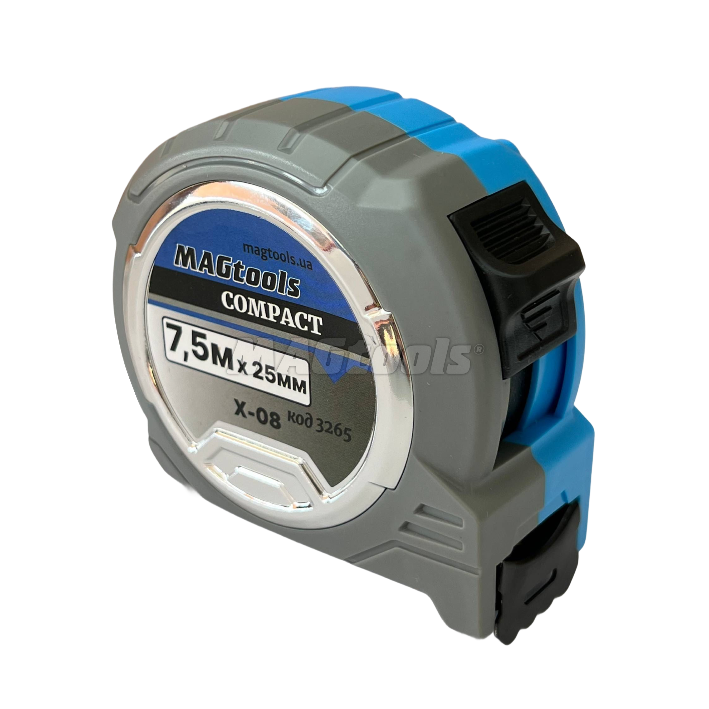 Рулетка Х-08 Magtools Compact выполнена из прочного АБС пластика, устойчивого к механическим воздействиям, размером 3м х16 мм, 5м х25 мм, 7,5м х25 мм, 10м х 25 мм. Эргономичная форма, облегченный вес гарантируют удобство работы. Стальная, гибкая лента со специальным антикоррозийным покрытием прослужит длительный срок. Рулетка имеет мощный механизм возврата мерной ленты. Реальный ноль крепится не к мерному полотну, а к усиливающей пластине.