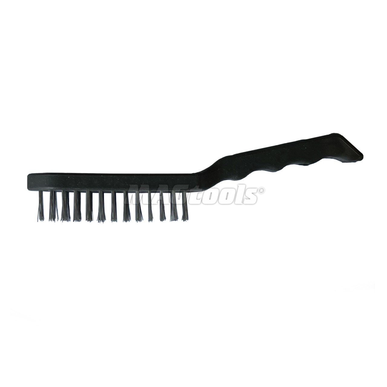 Щетка по металлу 6-рядная с пластиковой ручкой MAGtools предназначена для ручной очистки поверхностей от ржавчины, грязи, старых лакокрасочных покрытий и других загрязнений. Оснащена эргономичной пластиковой рукояткой с отверстиями для подвески. Щетка имеет прочную стальную проволочную щетину в шесть рядов.