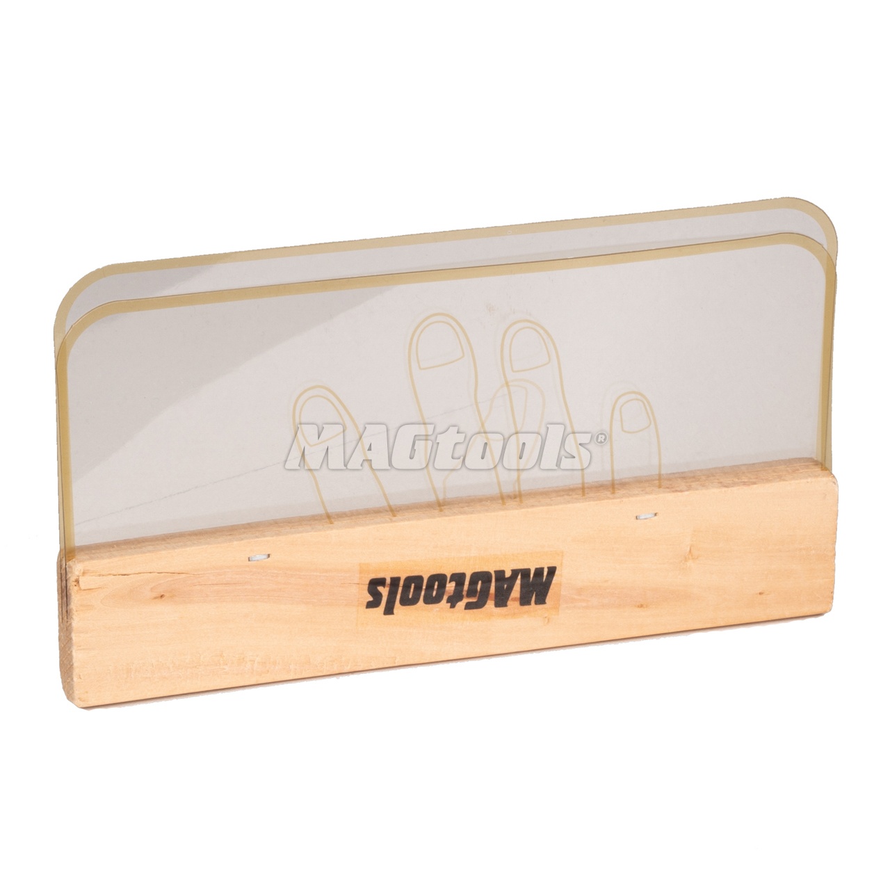 Шпатель для структуры прозрачный "жабка" с деревянной ручкой и двумя гибкими пластинами из прозрачного пластика в основном используется для нанесения мультиколорных красок в паре с флейцевой кистью. Конструкция шпателя позволяет равномерно распределить частицы краски, регулируя и выравнивая силу нажатием. Также "жабка" может применяться при нанесении покрытия с эффектом бархата.