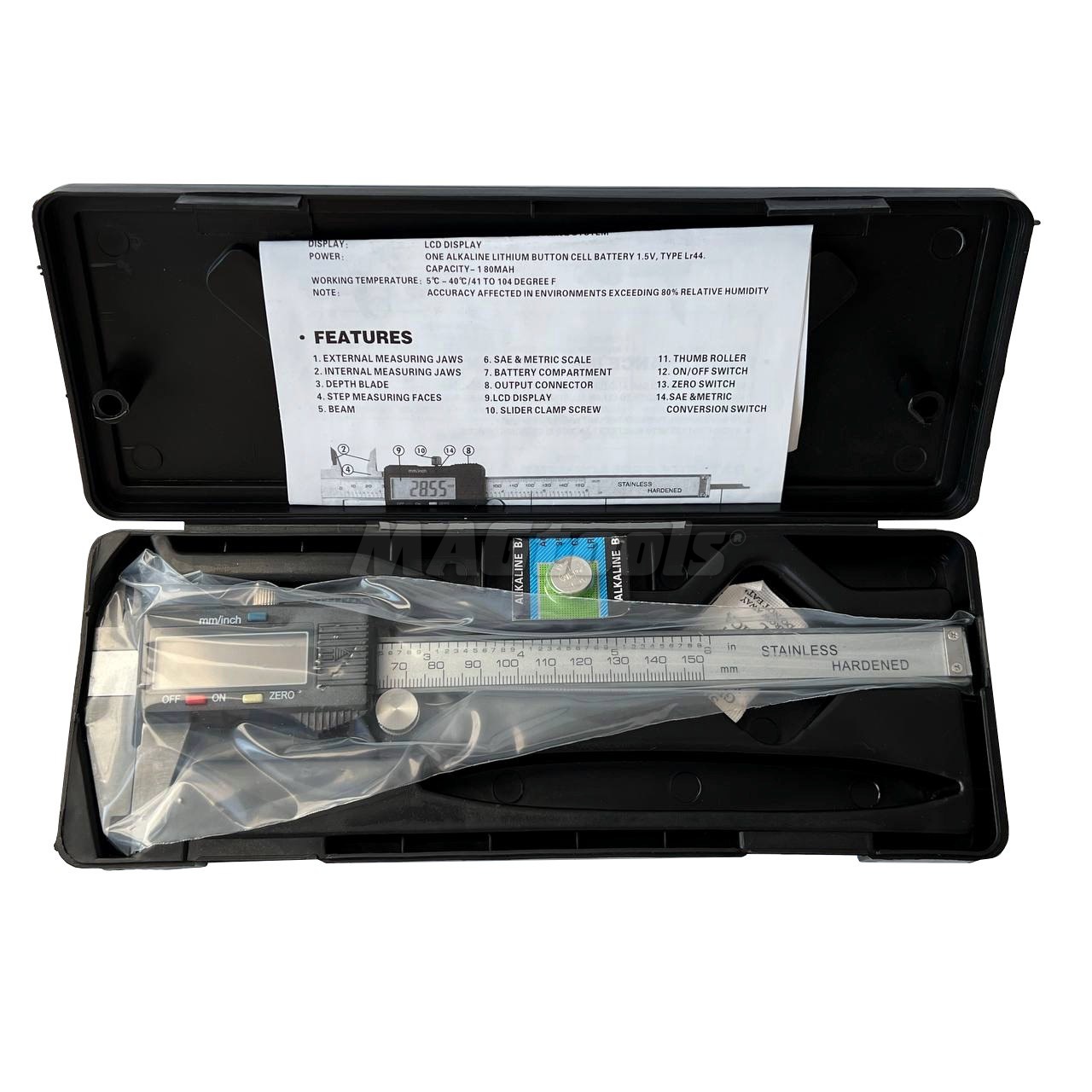 Штангенциркуль электронный MAGtools - универсальный инструмент, предназначенный для высокоточных измерений наружных и внутренних размеров, а также глубин отверстий с максимальным диапазоном измерений 150 мм, при точности измерения в 0,02 мм. Прочная конструкция штангенциркуля, выполненная из высококачественной нержавеющей стали с хромированным покрытием, позволит уберечь инструмент от негативного влияния коррозии, обеспечивая более продолжительную работу. Поставляется в пластиковом кейсе для хранения.