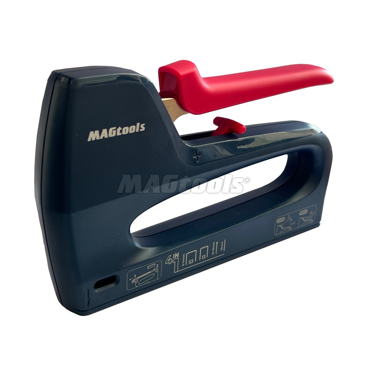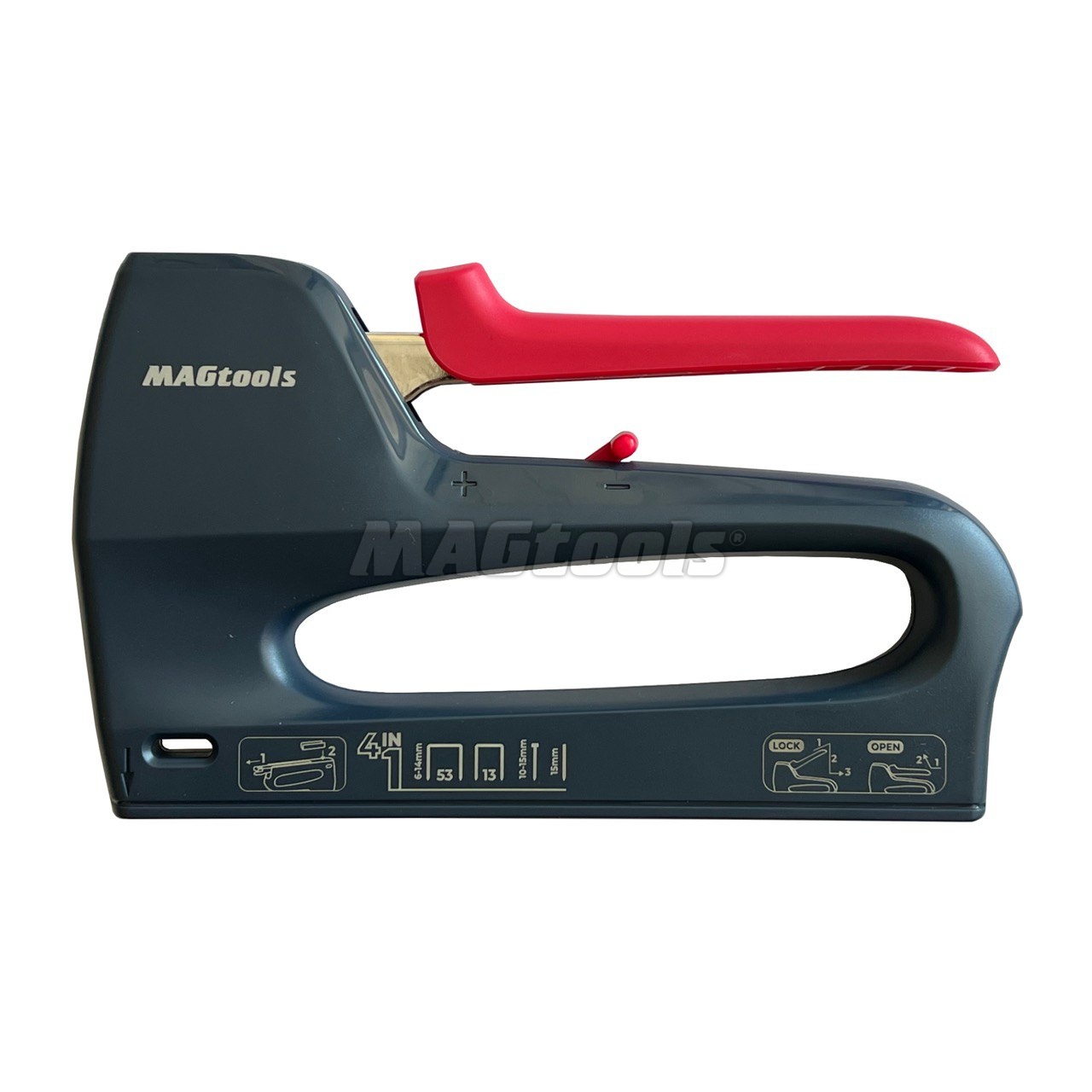 Степлер рессорный 4-in-1, скобо/гвоздозабивной. К степлеру подходят скобы типа 53 и 13 (размер 6-14 мм), а также гвозди типа 180, 18G (размер 10-15 мм). Используется для крепления материала к поверхностям из дерева, гипсокартона, фанеры, ДВП, пластика и т.п. Степлер обладает ударопрочным пластиковым корпусом, оснащен ударным рессорным механизмом с металлическим спусковым рычагом. Двухпозиционный регулятор мощности позволяет использовать степлер для более или менее плотных материалов.