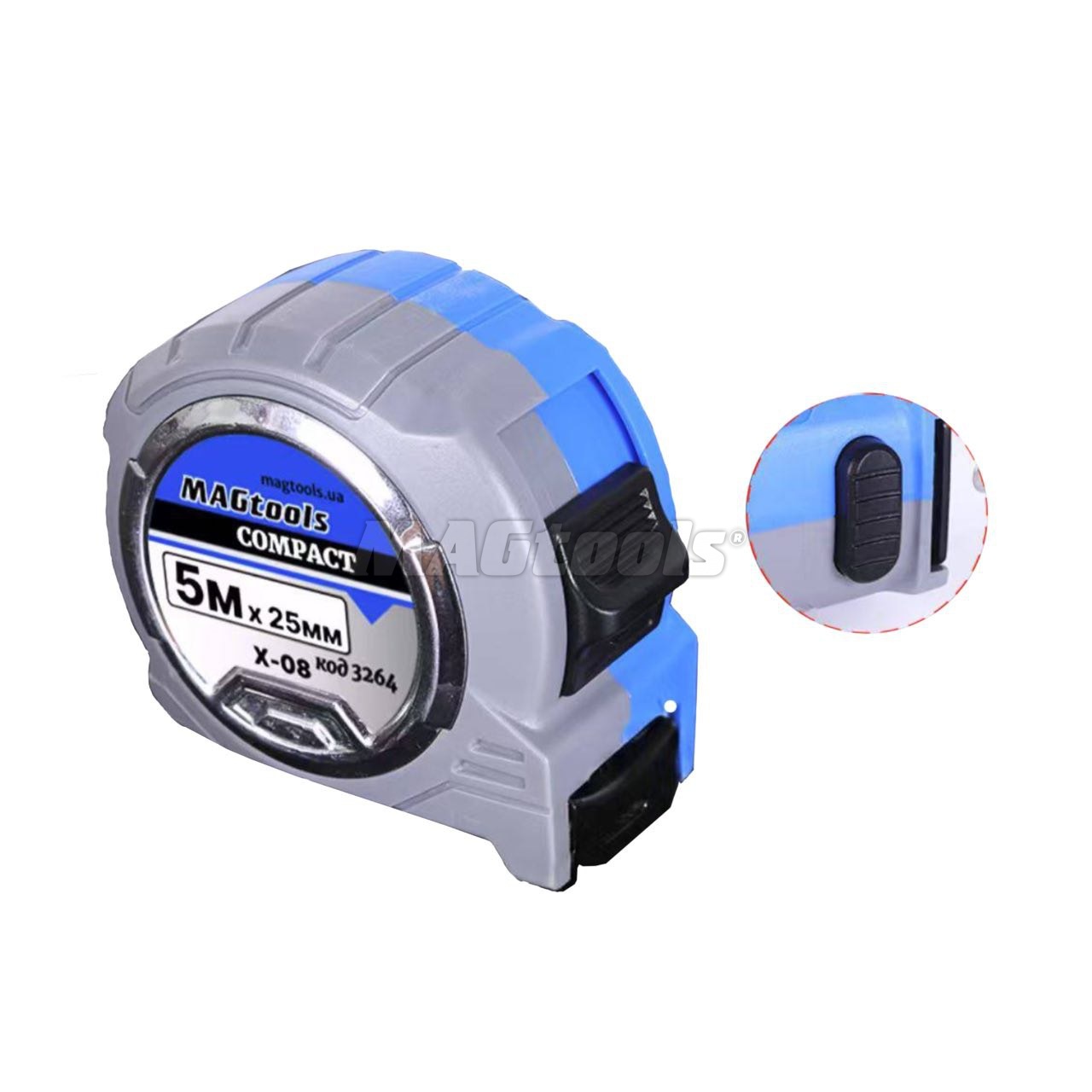 Рулетка Х-08 Magtools Compact виготовлена з міцного АБС пластику, стійкого до механічних впливів. Ергономічна форма, полегшена вага гарантують зручність роботи. Сталева гнучка стрічка зі спеціальним антикорозійним покриттям прослужить тривалий термін. Рулетка має потужний механізм повернення мірної стрічки. Реальний нуль кріпиться не до мірного полотна, а до пластини, що підсилює.